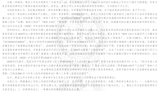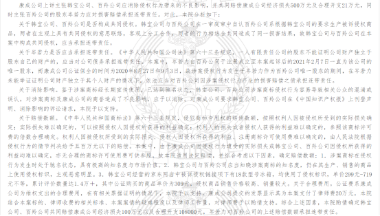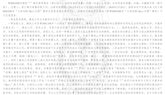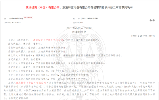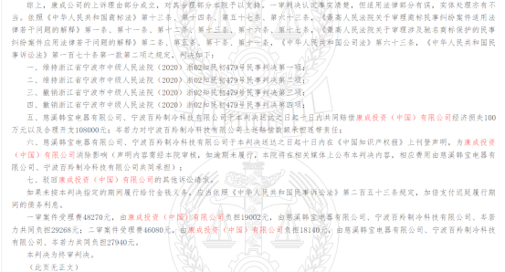 綜上判決,判定慈溪韓寶電器有限公司、寧波百羚制冷科技有限公司,共同賠償康成投資(中國)有限公司經(jīng)濟(jì)損失100萬元。